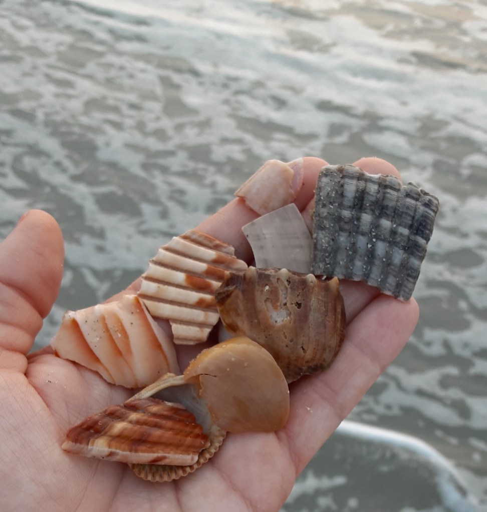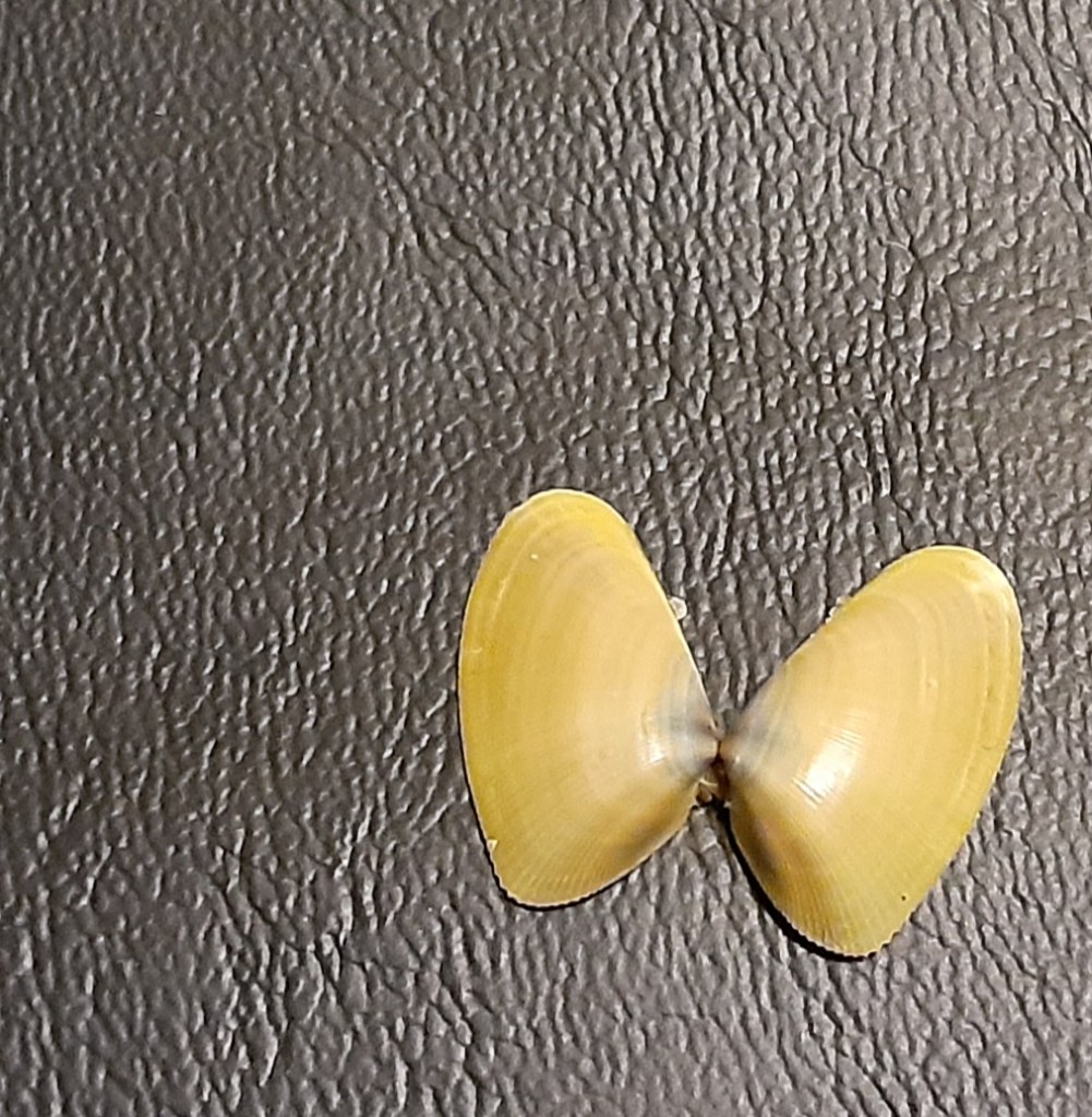 All this “training” means I can’t help but look for shells no matter what beach I visit. Even along the shores of the Great Lakes, where I might only find mussel shells or fossilized imprints, I hunt. And last week, when we visited the Atlantic coast in South Carolina, I couldn’t keep my eyes off of the sand. The Gulf of Mexico is relatively calm and tends to preserve seashells, but the waves of the Atlantic pound them to pieces, and in five days at the beach, I saw very few unbroken shells. I’m particularly proud of the whole coquina I found, yellow-green and splayed open like a butterfly.